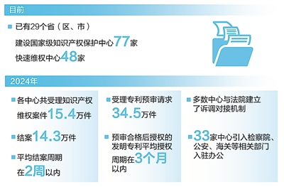 保護(hù)知識(shí)產(chǎn)權(quán)就是保護(hù)創(chuàng)新。中共中央、國務(wù)院印發(fā)的《知識(shí)產(chǎn)權(quán)強(qiáng)國建設(shè)綱要(2021—2035年)》提出,“建立完善知識(shí)產(chǎn)權(quán)仲裁、調(diào)解、公證、鑒定和維權(quán)援助體系”。目前,已有29個(gè)?。▍^(qū)、市)建設(shè)國家級(jí)知識(shí)產(chǎn)權(quán)保護(hù)中心77家、快速維權(quán)中心48家。