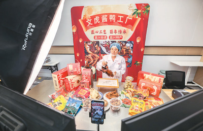 在浙江省嘉興市南湖區(qū)湘家蕩農(nóng)業(yè)加工園,老字號(hào)企業(yè)嘉興文虎醬鴨股份有限公司的直播間內(nèi),工作人員在直播銷售醬鴨。