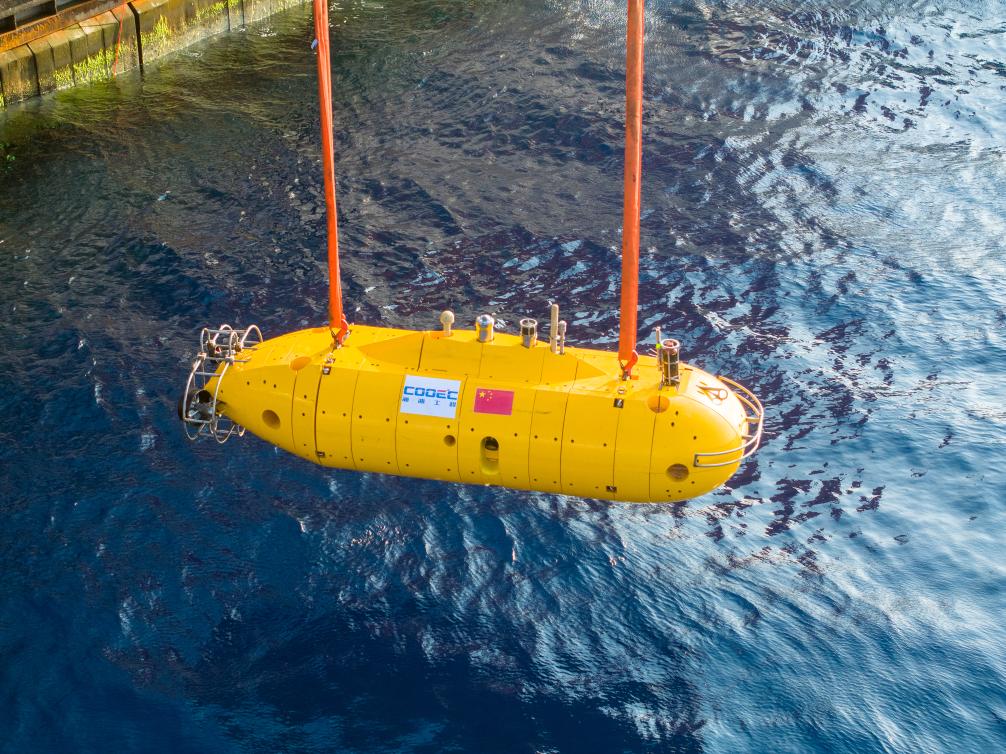 我國自主研發(fā)深水海管鋪設(shè)智能監(jiān)測裝備“海衛(wèi)”系統(tǒng)水下自主遙控機(jī)器人進(jìn)行入海測試。(海油工程供圖)