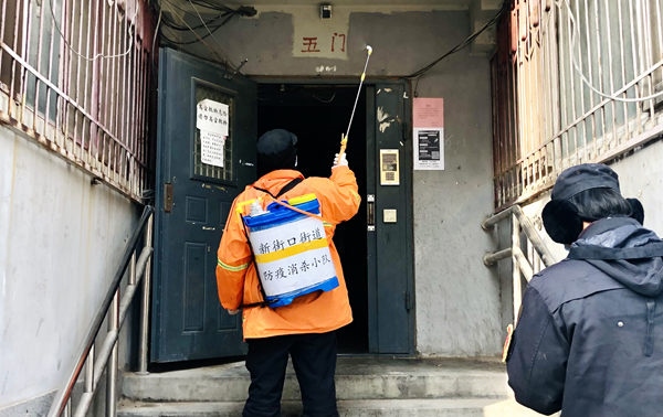 北草廠社區(qū)工作人員正在進(jìn)行樓道消殺工作。人民網(wǎng) 王紫攝
