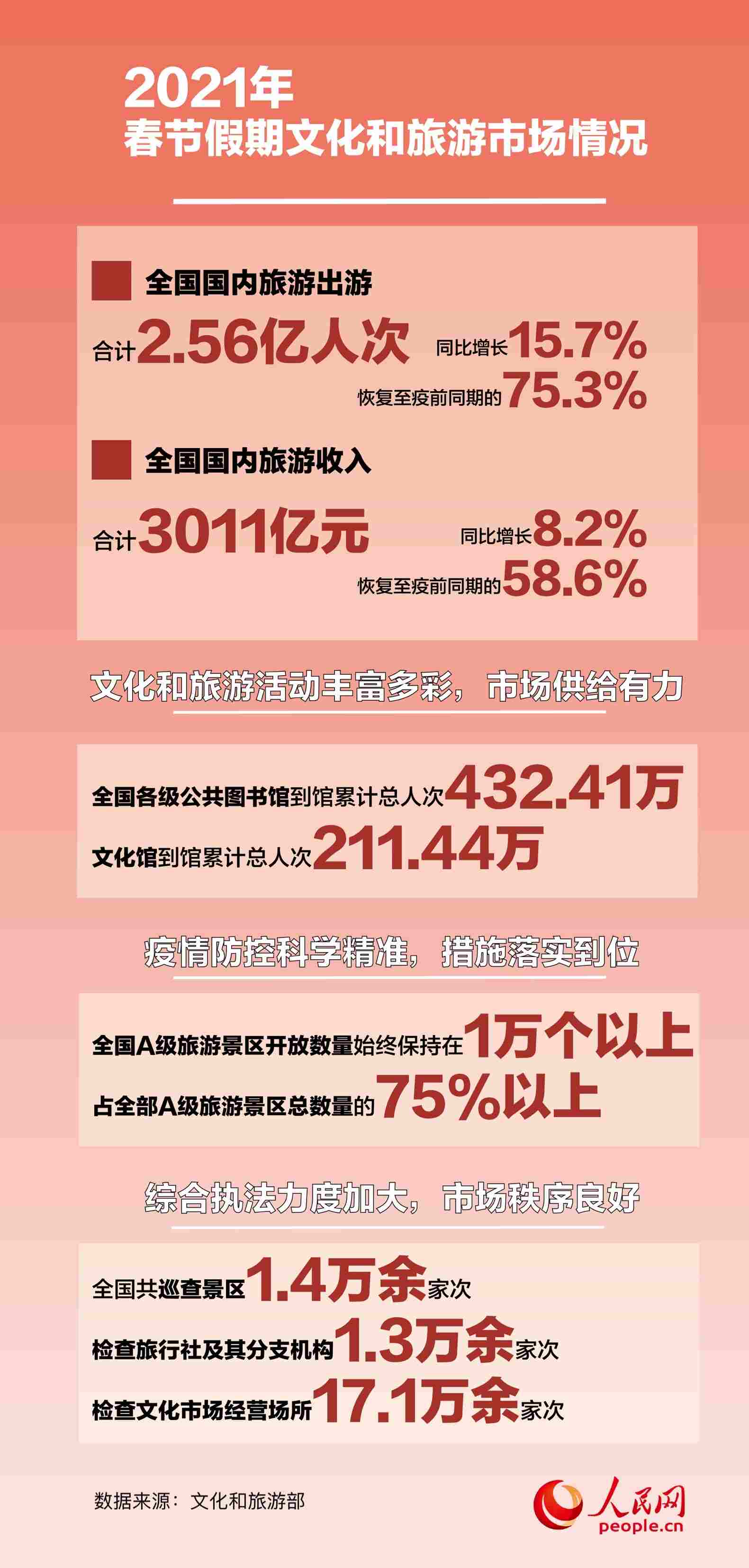 人民網(wǎng)北京2月25日電 (白帆)2月25日,文化和旅游部發(fā)布了2021年春節(jié)假期文化和旅游市場(chǎng)情況。數(shù)據(jù)顯示,綜合各地文化和旅游部門、通訊運(yùn)營(yíng)商、線上旅行服務(wù)商的數(shù)據(jù),經(jīng)文化和旅游部數(shù)據(jù)中心測(cè)算,春節(jié)假期七天,全國(guó)國(guó)內(nèi)旅游出游合計(jì)2.56億人次,同比增長(zhǎng)15.7%,恢復(fù)至疫前同期的75.3%。實(shí)現(xiàn)國(guó)內(nèi)旅游收入3011億元,同比增長(zhǎng)8.2%,恢復(fù)至疫前同期的58.6%。