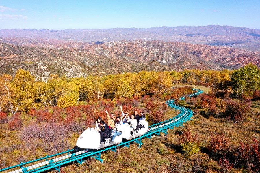 9月26日,游客乘坐小火車游玩固陽馬鞍山