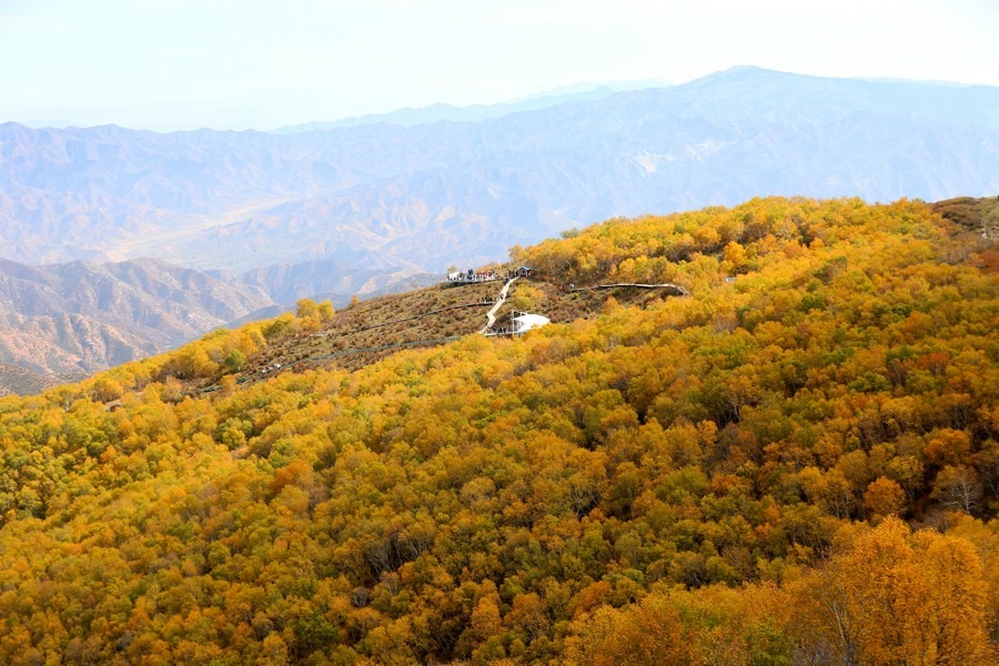 9月26日,游客在一片金黃的固陽馬鞍山游玩