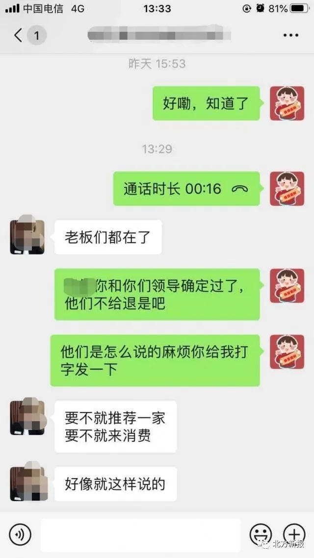 高先生提供給記者的一份微信聊天記錄顯示,當(dāng)高先生提出退還押金的要求時(shí),白泉山莊海世盛宴的工作人員告知,要不就推薦其他人到這里舉辦婚禮,要不就來這里消費(fèi)以抵消押金??傊?,押金是不能退的。
