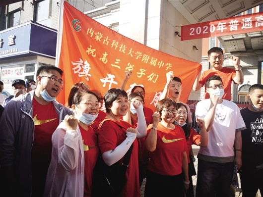 在包四中考場(chǎng),不少畢業(yè)班的老師身穿紅色T恤,前來給考生們送考,加油。