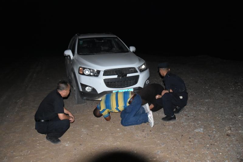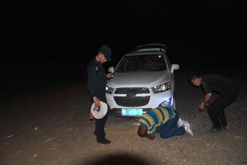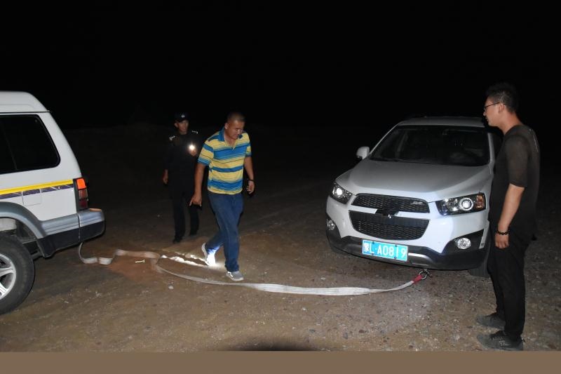 正當(dāng)二人漸漸失去希望的時(shí)候,當(dāng)晚10點(diǎn)10分,遠(yuǎn)處一道燈光閃過,原來,阿拉善邊境管理支隊(duì)溫圖高勒邊境派出所民警下鄉(xiāng)走訪正好路過。得知二人情況后,民警立即展開救援,一路迅速找出隨身攜帶的干糧、礦泉水為二人補(bǔ)充體力,一路找出牽引繩對(duì)被困車輛開展救援,經(jīng)過6個(gè)小時(shí)的拖拽,終于在凌晨4點(diǎn)將兩名群眾安全帶到了派出所。