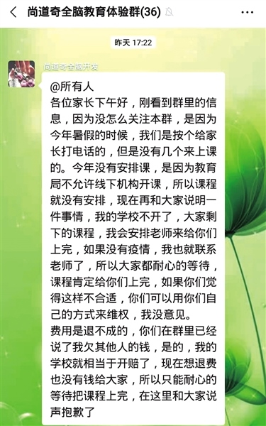 根據(jù)謝女士提供的轉(zhuǎn)賬證明和聊天截圖記者注意到,“尚道奇全腦教育體驗群”1月15日發(fā)布的一則通知稱,今年暑假,機構(gòu)老師曾挨個給家長打電話通知上課,但是沒有幾個來上課的,加上教育局不允許線下機構(gòu)開課,所以課程遲遲沒有安排。并稱學(xué)校賠錢了,沒有錢退給大家,只能耐心等待疫情結(jié)束后安排上課,如果家長覺得不合適,可以用自己的方式維權(quán)?!八恼f辭明顯前后矛盾,暑假期間說課件損毀,現(xiàn)在又說沒學(xué)生上課?!敝x女士氣憤地說,和她遭遇同樣情況的還有30多名家長,399元雖然不是大數(shù)目,但這樣欺騙大家實屬不該。