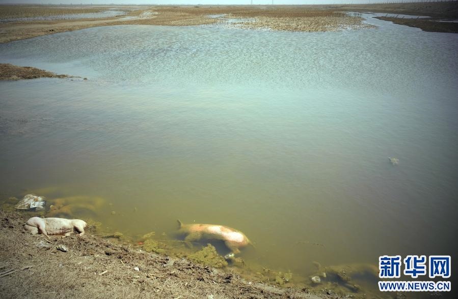 這是3月20日在達(dá)拉特旗黃河國堤內(nèi)拍攝的死豬。新華社記者 賈立君 攝
