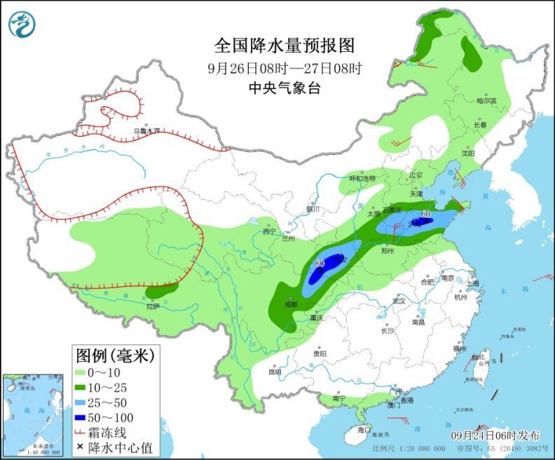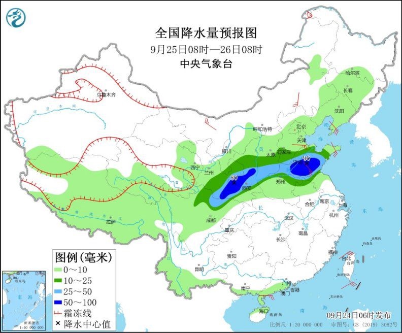 9月25日08時至26日08時,西北地區(qū)東部、華北南部、黃淮大部等地部分地區(qū)有中到大雨,其中,甘肅東部、陜西中南部、山東中南部等地部分地區(qū)有暴雨(50~90毫米)。內(nèi)蒙古中西部、遼東半島等地部分地區(qū)有4~6級風。