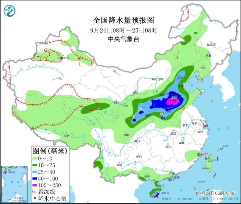 9月24日08時至25日08時,西北地區(qū)東部、華北大部、黃淮中北部、海南島等地部分地區(qū)有中到大雨,其中,陜西中南部、華北南部、山東西部、河南北部、海南島東南部等地部分地區(qū)有暴雨或大暴雨(100~140毫米)。新疆南疆盆地等地部分地區(qū)有4~6級風,新疆東部部分地區(qū)有8~9級風。