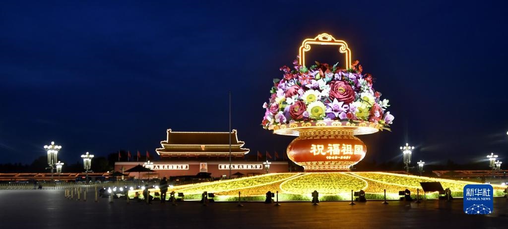 夜晚天安門廣場上的“祝福祖國”主題花壇(9月27日攝) 新華社記者 李欣 攝