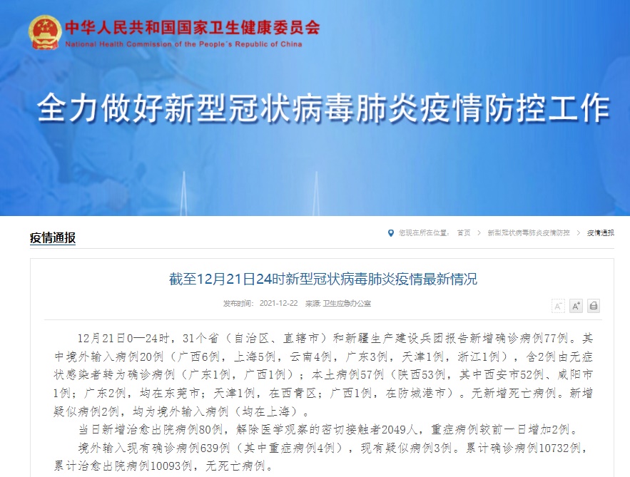 12月21日0—24時,31個省(自治區(qū)、直轄市)和新疆生產(chǎn)建設(shè)兵團(tuán)報(bào)告新增確診病例77例。其中境外輸入病例20例(廣西6例,上海5例,云南4例,廣東3例,天津1例,浙江1例),含2例由無癥狀感染者轉(zhuǎn)為確診病例(廣東1例,廣西1例);本土病例57例(陜西53例,其中西安市52例、咸陽市1例;廣東2例,均在東莞市;天津1例,在西青區(qū);廣西1例,在防城港市)。無新增死亡病例。新增疑似病例2例,均為境外輸入病例(均在上海)。