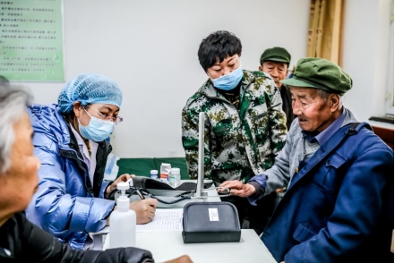醫(yī)務人員為光榮院里的老人進行基礎身體檢查
