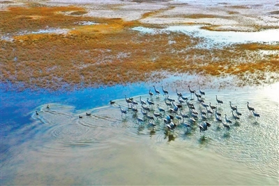 3月的鄂托克草原春光明媚、萬(wàn)物復(fù)蘇。黃河一級(jí)支流——都思圖河兩岸,風(fēng)吹草偃間,珍禽掠影過(guò),灰鶴、赤麻鴨、天鵝、豆雁等各種鳥類在河中嬉戲打鬧,一幅人與自然和諧共生的美麗生態(tài)畫卷徐徐呈現(xiàn)。
