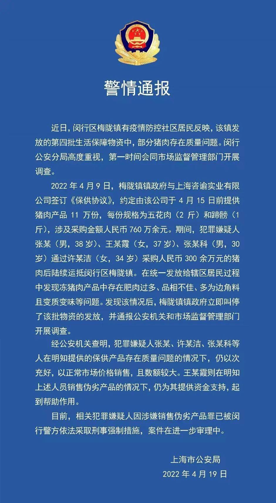 警方通報(bào):2022年4月9日,梅隴鎮(zhèn)鎮(zhèn)政府與上海咨諭實(shí)業(yè)有限公司簽訂《保供協(xié)議》,約定由該公司于4月15日前提供豬肉產(chǎn)品11萬份,每份規(guī)格為五花肉(2斤)和蹄髈(1斤),涉及采購金額人民幣760萬余元。其間,犯罪嫌疑人張某(男,38歲)、王某霞(女,37歲)、張某科(男,30歲)通過許某潔(女,34歲)采購人民幣300余萬元的豬肉后陸續(xù)運(yùn)抵閔行區(qū)梅隴鎮(zhèn)。在統(tǒng)一發(fā)放給轄區(qū)居民過程中發(fā)現(xiàn)凍豬肉產(chǎn)品中存在肥肉過多、品相不佳、多為邊角料且變質(zhì)變味等問題。發(fā)現(xiàn)該情況后,梅隴鎮(zhèn)鎮(zhèn)政府立即叫停了該批物資的發(fā)放,并通報(bào)公安機(jī)關(guān)和市場(chǎng)監(jiān)督管理部門開展調(diào)查。