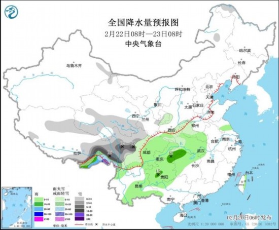 2月22日08時(shí)至23日08時(shí),西藏東部、云南西北部、青海南部、川西高原、甘肅東部、陜西東南部、河南西部等地部分地區(qū)有小到中雪或雨夾雪,其中,西藏東部、川西高原、云南西北部等地局地有大到暴雪(10~15毫米)。西南地區(qū)大部、江漢大部、湖南西部和北部等地部分地區(qū)有小到中雨,其中,西藏東南部局地有大到暴雨。臺(tái)灣海峽、巴士海峽、南海東部等地部分地區(qū)有6~7級(jí)風(fēng),陣風(fēng)8級(jí)。