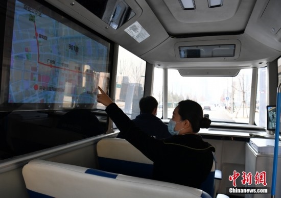 2月22日,智能網(wǎng)聯(lián)巴士901線測(cè)試車輛測(cè)試員正在介紹公交路線。雄安新區(qū)的智能網(wǎng)聯(lián)巴士近期正在進(jìn)行投入運(yùn)營(yíng)前的道路測(cè)試,該巴士配備了超高感度攝像頭、超聲波雷達(dá)、激光雷達(dá)、毫米波雷達(dá)等感知設(shè)備,組成了車輛的“眼睛”。車輛可自主識(shí)別紅綠燈、道路提示牌和車道標(biāo)線等,做出跟車、超車、停車等動(dòng)作。中新社記者 韓冰 攝