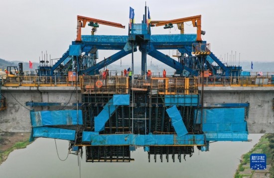 3月18日在位于四川省瀘州市拍攝的渝昆高鐵瀘州沱江特大橋主跨合龍施工現(xiàn)場(無人機照片)。
