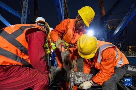 3月18日,在位于四川省瀘州市的渝昆高鐵瀘州沱江特大橋主跨合龍現(xiàn)場,施工人員在進行混凝土澆筑。