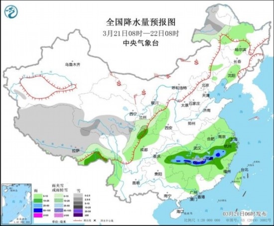 全國降水量預(yù)報圖(3月21日08時-22日08時)