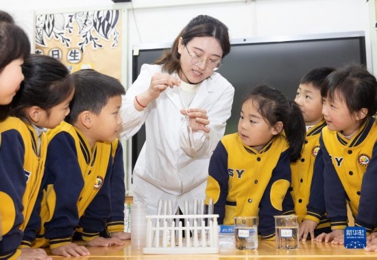3月22日,在浙江省諸暨市實(shí)驗(yàn)幼兒園,老師帶領(lǐng)小朋友做水樣檢測實(shí)驗(yàn)。