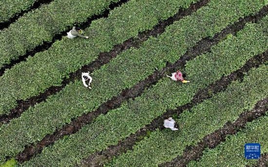 3月21日,在貴州省貴陽市開陽縣禾豐鄉(xiāng)馬頭村,茶農(nóng)在采茶(無人機照片)。