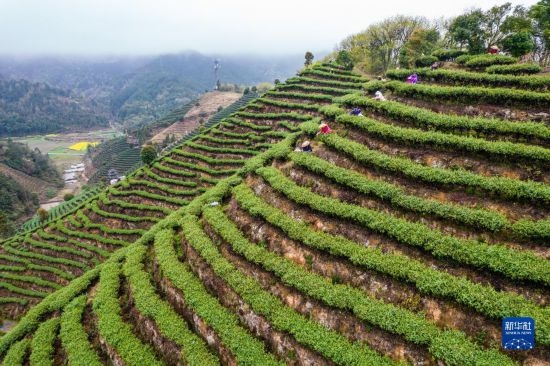 3月21日,在湖南省永州市江華瑤族自治縣橋市鄉(xiāng)大魚塘村,茶農(nóng)在茶園采茶(無人機照片)。