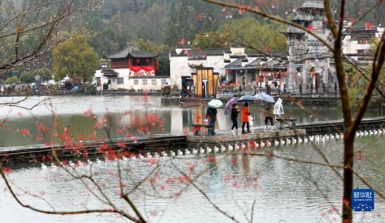 3月24日,游客在黟縣宏村南湖游覽(無人機(jī)照片)。