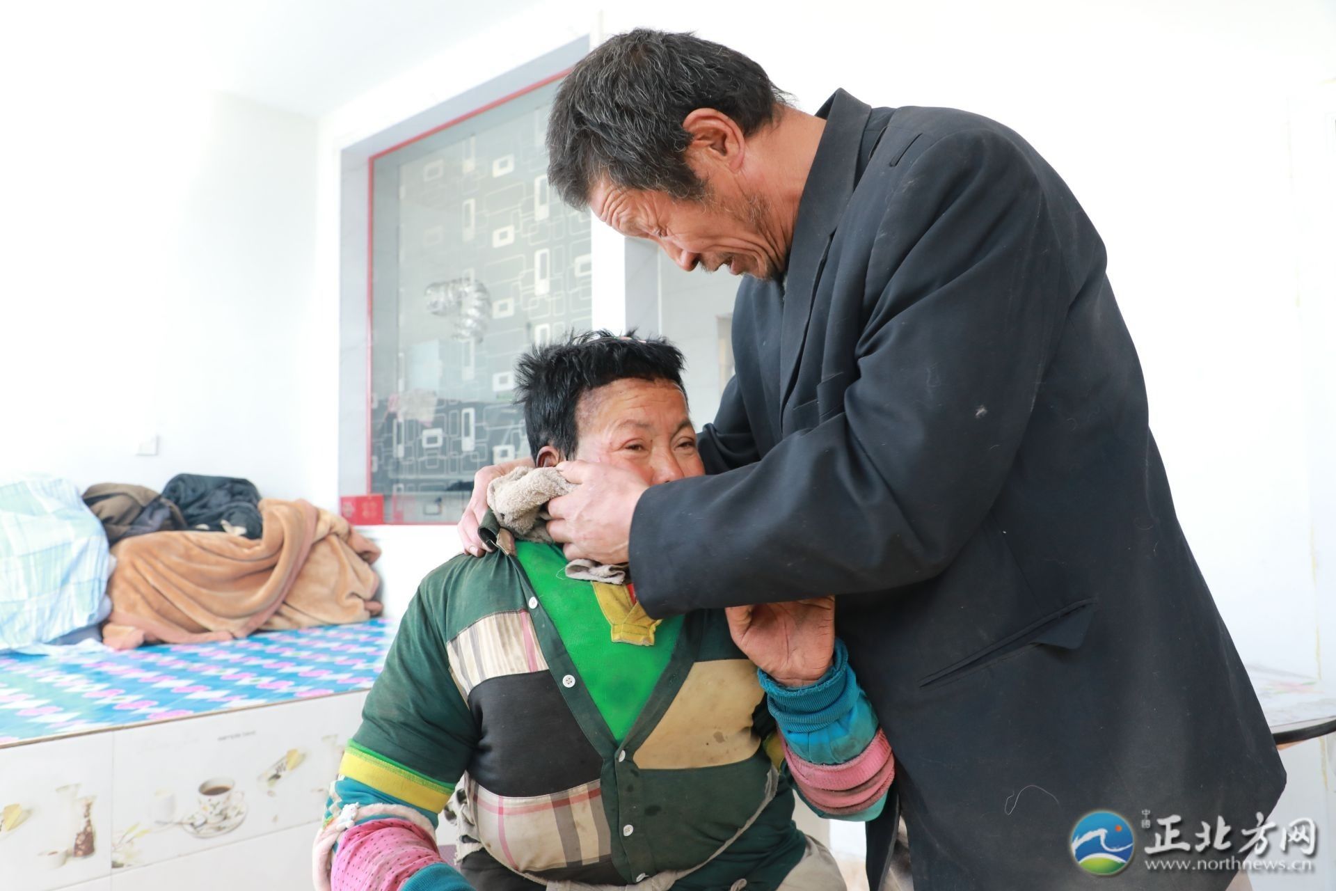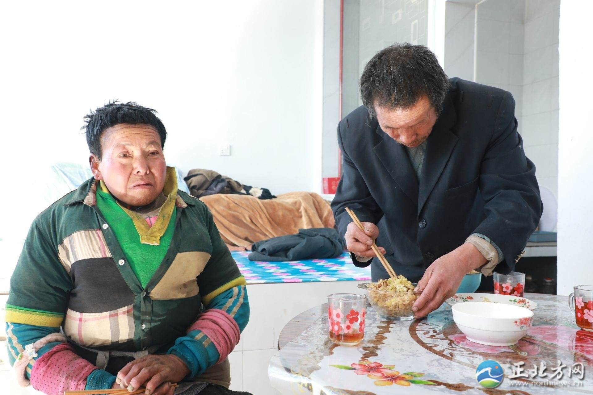 在采訪間隙,何蘭鎖的妻子王林愛回到了家,見到有陌生人顯得很局促。王林愛患有精神疾病,說話顛三倒四。何蘭鎖拿起毛巾,溫柔地為妻子擦拭沾滿灰塵的臉和手,端出早早做好的飯放在桌上:“快吃吧,有你最愛吃的咸菜。”“林愛其實(shí)命最苦了,啥也懂不得,我要不在了,她一個(gè)人可咋辦呀。我現(xiàn)在最大的心愿是希望能讓她去接受治療?!焙翁m鎖止不住地哽咽道。