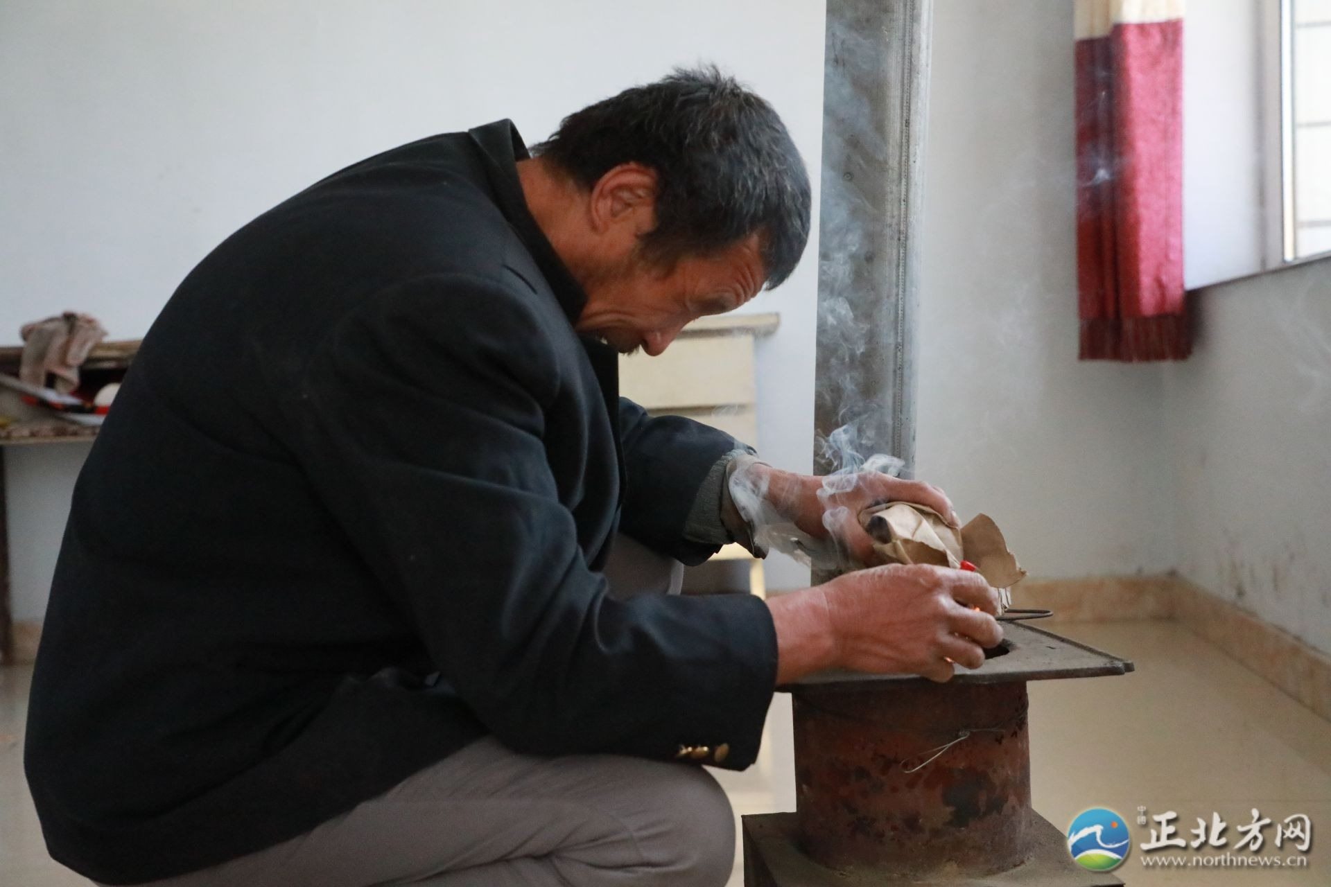 何蘭鎖63歲,黝黑的臉膛,兩個(gè)眼窩深陷,看不到眼珠。聽到記者來采訪,他熱情地把記者讓進(jìn)屋,摸索著拿起水壺倒了兩杯熱茶,“你們稍坐一坐,家里有點(diǎn)冷。”何蘭鎖笑起來眉眼彎彎,說著,又轉(zhuǎn)身拿著錘子,熟門熟路地進(jìn)入涼房去打炭,開始生火。