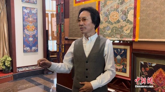非遺傳承人拉孟長期致力于免費培養(yǎng)唐卡傳承人。圖為拉孟介紹唐卡文化。中新網(wǎng)記者 劉湃 攝