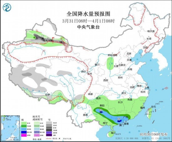 3月30日08時至31日08時,新疆沿天山地區(qū)、西藏東部和南部、川西高原南部、青海東北部、甘肅東部等地部分地區(qū)有小到中雪或雨夾雪,其中,新疆沿天山等地部分地區(qū)有大雪(5~8毫米);新疆伊犁河谷、西藏東南部、西北地區(qū)東北部、四川東南部、重慶南部、貴州、云南東部、湖南南部、江西中南部、浙江、福建、廣西、廣東、海南島等地部分地區(qū)有小到中雨。新疆北部、內(nèi)蒙古中部、黑龍江東部、遼東半島等地部分地區(qū)有4~6級風(見圖1)。東海大部海域有5~7級風,陣風8級。
