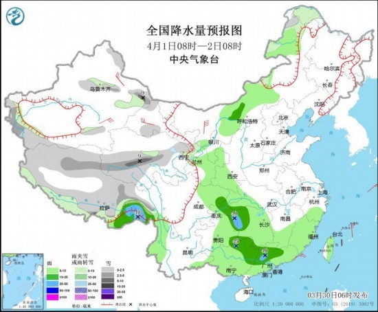 圖1 全國降水量預報圖(3月30日08時-31日08時)