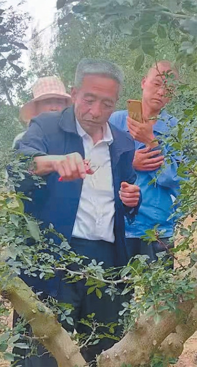 甘肅省秦安縣農(nóng)業(yè)技術(shù)推廣研究員靳志強(中)向農(nóng)民傳授剪枝技術(shù)。潘虎林?jǐn)z