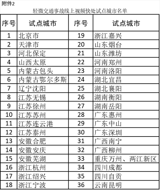 2、輕微交通事故線上視頻快處試點(diǎn)城市名單