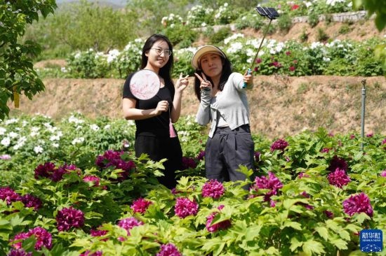 4月16日,游客在白臺峪村牡丹農(nóng)業(yè)產(chǎn)業(yè)園拍照游玩。