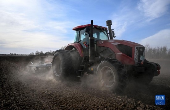 4月12日,在通遼市科爾沁左翼中旗腰林毛都鎮(zhèn),農(nóng)機在田間整地。