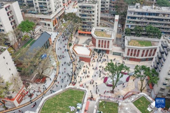 4月28日,在竣工亮相的重慶市九龍坡區(qū)謝家灣街道民主村片區(qū)城市更新項(xiàng)目(一期),人們?cè)谝惶幑部臻g休息(無人機(jī)照片)。