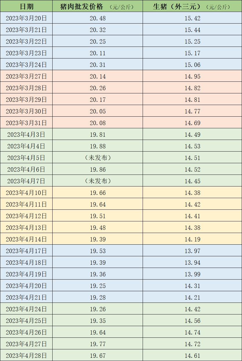 4月24日,國家統(tǒng)計局發(fā)布2023年4月中旬流通領(lǐng)域重要生產(chǎn)資料市場價格變動情況。其中,生豬(外三元)價格為14.1元/公斤,與4月上旬相比,每公斤下降0.4元,下降幅度為2.8%。