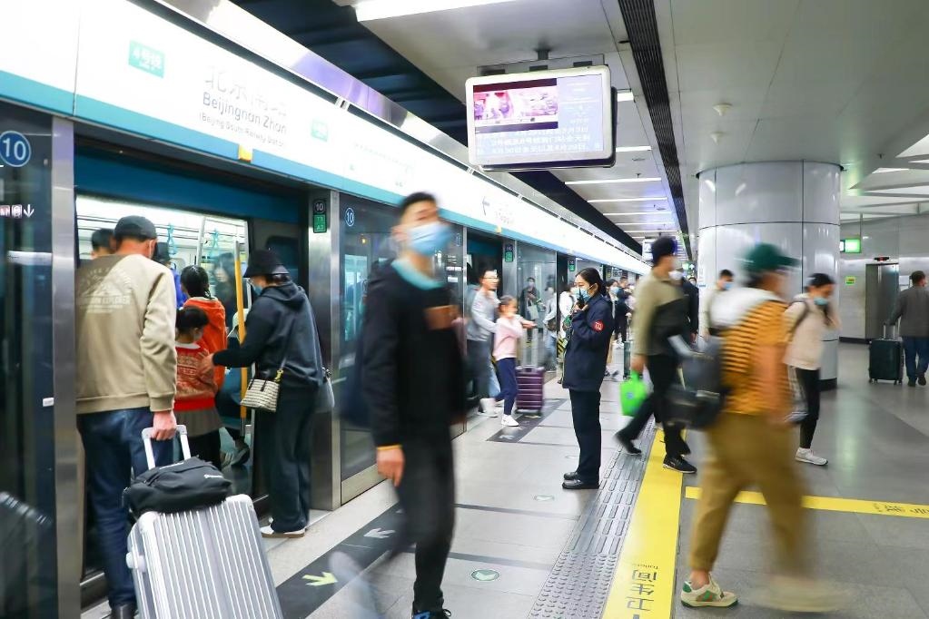 “大家進站時要小心腳下的行李箱。”3日14時,隨著大量鐵路旅客抵達北京南站,地鐵4號線北京南站也開始變得忙碌。站廳內,工作人員在自動售票機、閘機前引導旅客快速購票進站;站臺上,軌道列車準時抵達,乘客快速流動疏散。