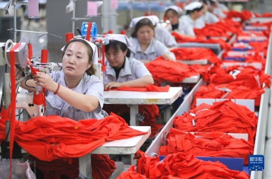 5月4日,在山東省青島市即墨區(qū)一家服裝企業(yè),工人生產出口到海外市場的服裝。