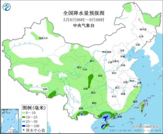 5月8日08時至9日08時,甘肅南部、青海南部、西藏北部等地部分地區(qū)有小到中雪或雨夾雪,部分地區(qū)有大到暴雪;四川盆地北部、云南東南部、廣西東南部、廣東西南部、海南島、臺灣島等地部分地區(qū)有中到大雨,其中,廣西東南部沿海、廣東西南部、海南島等地局部地區(qū)有暴雨(50~95毫米)。內(nèi)蒙古東北部、黑龍江等地部分地區(qū)有4~5級風;東海、臺灣海峽將有7級、陣風8級的東北風。
