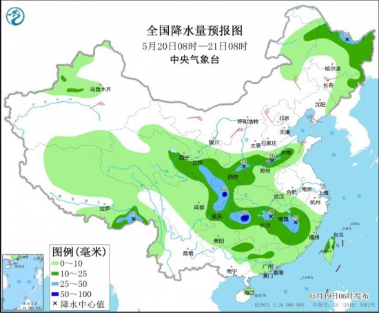 全國(guó)降水量預(yù)報(bào)圖(5月20日08時(shí)-21日08時(shí))。圖片來(lái)源:中央氣象臺(tái)網(wǎng)站