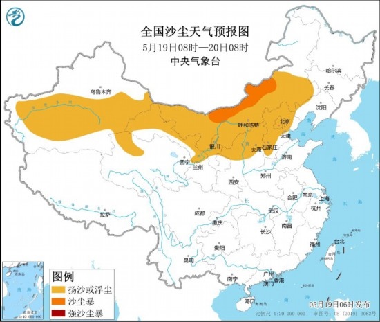 全國(guó)沙塵天氣預(yù)報(bào)圖(5月19日08時(shí)-20日08時(shí))。圖片來(lái)源:中央氣象臺(tái)網(wǎng)站
