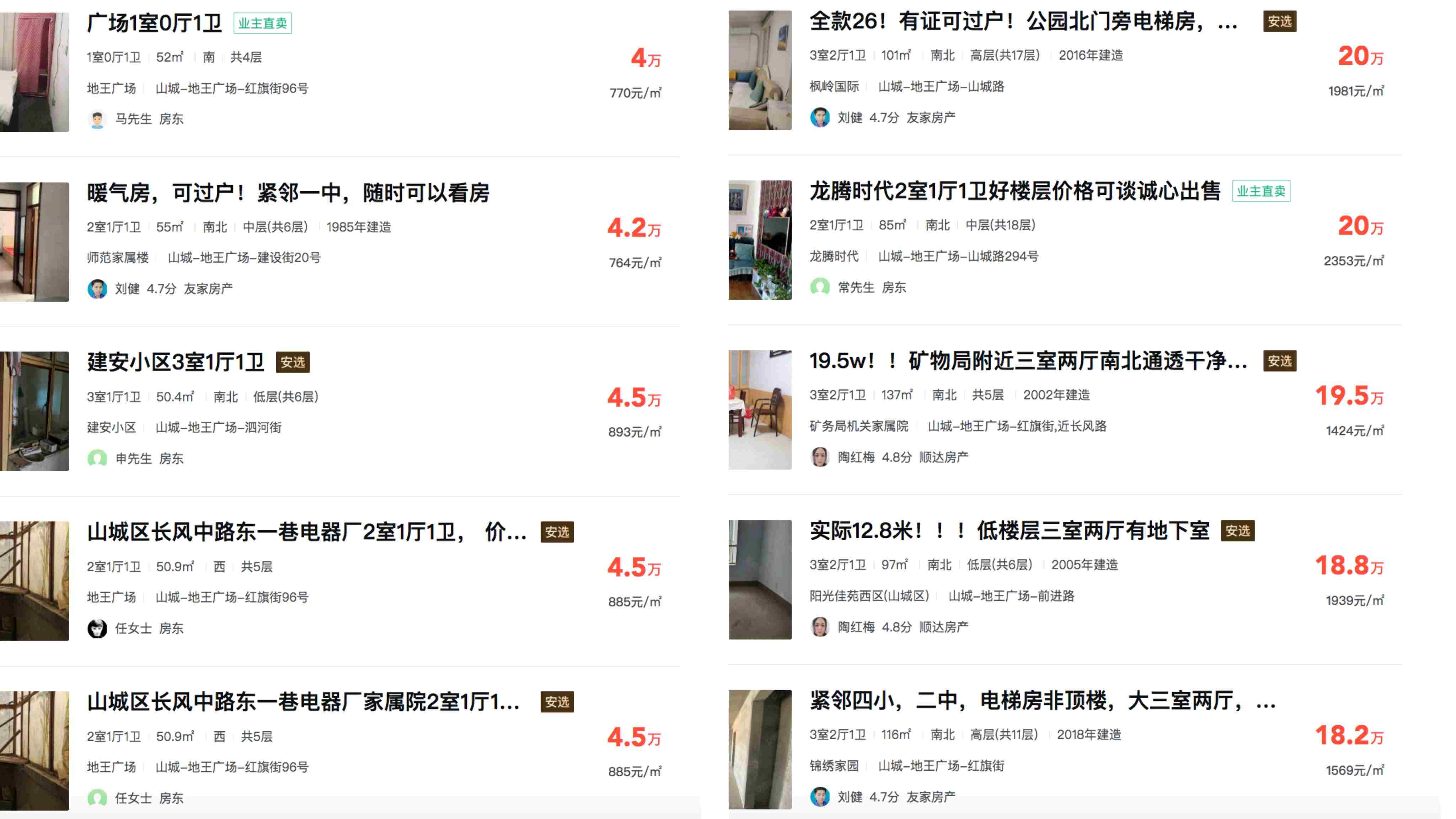 澎湃新聞從安居客平臺(tái)看到,鶴壁市低總價(jià)的房源確實(shí)存在,價(jià)格約在4萬元/套,且多集中于鶴壁市山城區(qū)。