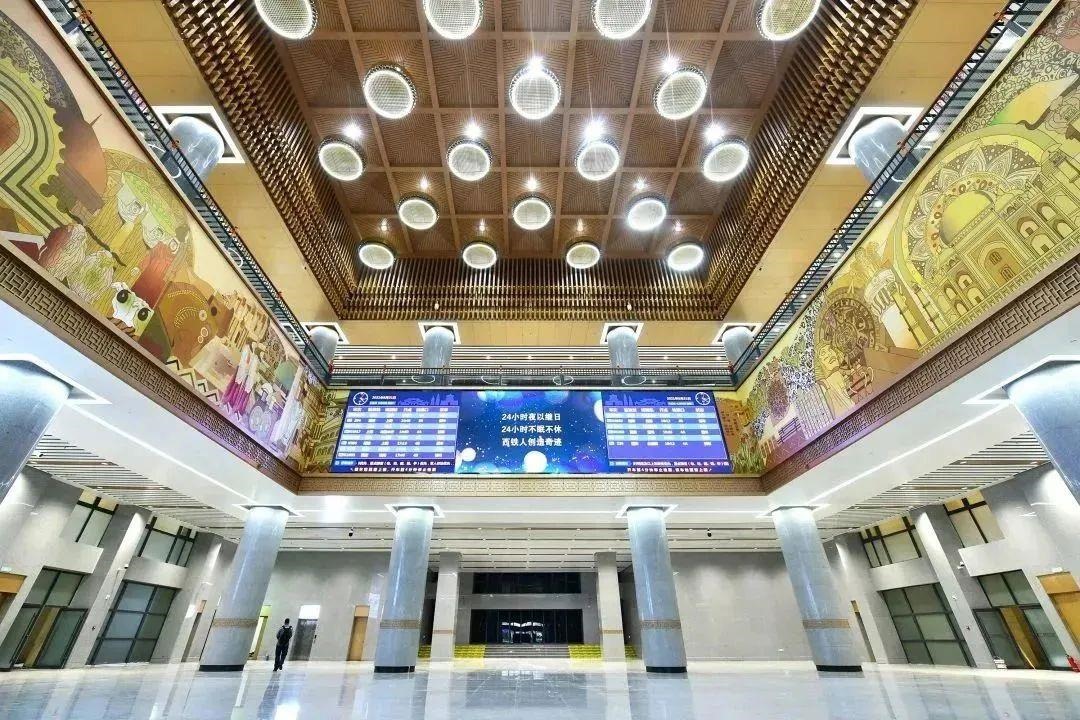 站房內(nèi),壁畫《絲路百景》展現(xiàn)了古今絲綢之路的文化延續(xù),北站房噴繪長卷壁畫《晉陜黃河八百里》,讓旅客一覽晉陜大美景觀。