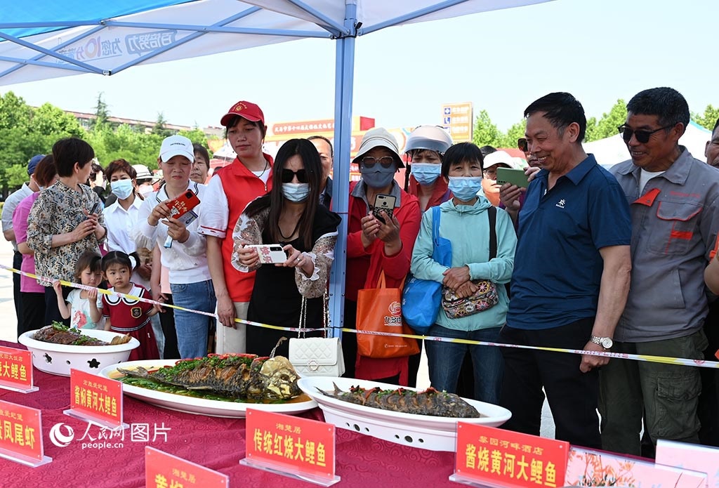 5月17日,“中國旅游日”主題周活動期間,河南省義馬市舉辦“櫻紅五月”美食節(jié),集中展示當?shù)氐奶厣朗场⒚麅?yōu)特產(chǎn),為了讓游客有更好的體驗,當?shù)?2家飯店還進行了精彩紛呈的廚藝大比拼?;顒蝇F(xiàn)場,游客在圍觀經(jīng)典豫菜“紅燒黃河大鯉魚”。人民網(wǎng)記者 王玉興攝