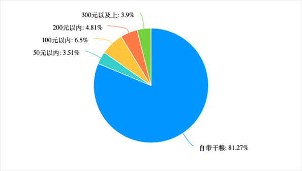 在用餐方面,有81.27%的受訪者選擇自帶干糧,每天餐費在100元以內(nèi)的占比為6.5%,每天餐費在200元和300元以內(nèi)的均不到5%??梢娫诓惋嫹矫?,此類游客都是能省則省,且并不介意簡餐。
