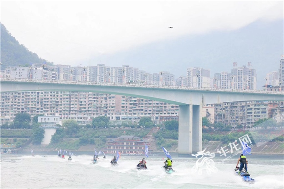 △來自全國各地的參賽選手騎著摩托艇入場(chǎng)。華龍網(wǎng)-新重慶客戶端 黃歡 攝