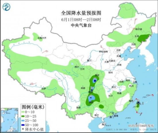 5月31日08時(shí)至6月1日08時(shí),陜西中南部、四川盆地東部和南部等地部分地區(qū)有中到大雨,其中,陜西南部、四川盆地東北部、重慶、臺(tái)灣島東北部等地部分地區(qū)有暴雨或大暴雨(100~120毫米)。內(nèi)蒙古、東北地區(qū)、四川盆地東部、浙江、福建沿海、臺(tái)灣島等地部分地區(qū)有4~6級(jí)風(fēng)。臺(tái)灣以東洋面將有8~9級(jí)、陣風(fēng)10級(jí)的偏北風(fēng),東海南部、巴士海峽將有7~8級(jí)風(fēng),陣風(fēng)9級(jí)。